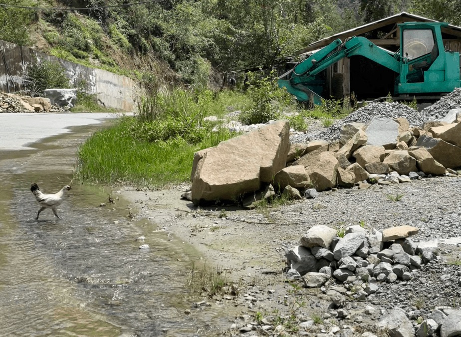 帰る頃には悪路にも慣れ、景色を楽しむ余裕が出てくる。通り過ぎていく山々を眺めながら車に揺られていると、ふと停車。ニワトリが道路を横断していた。