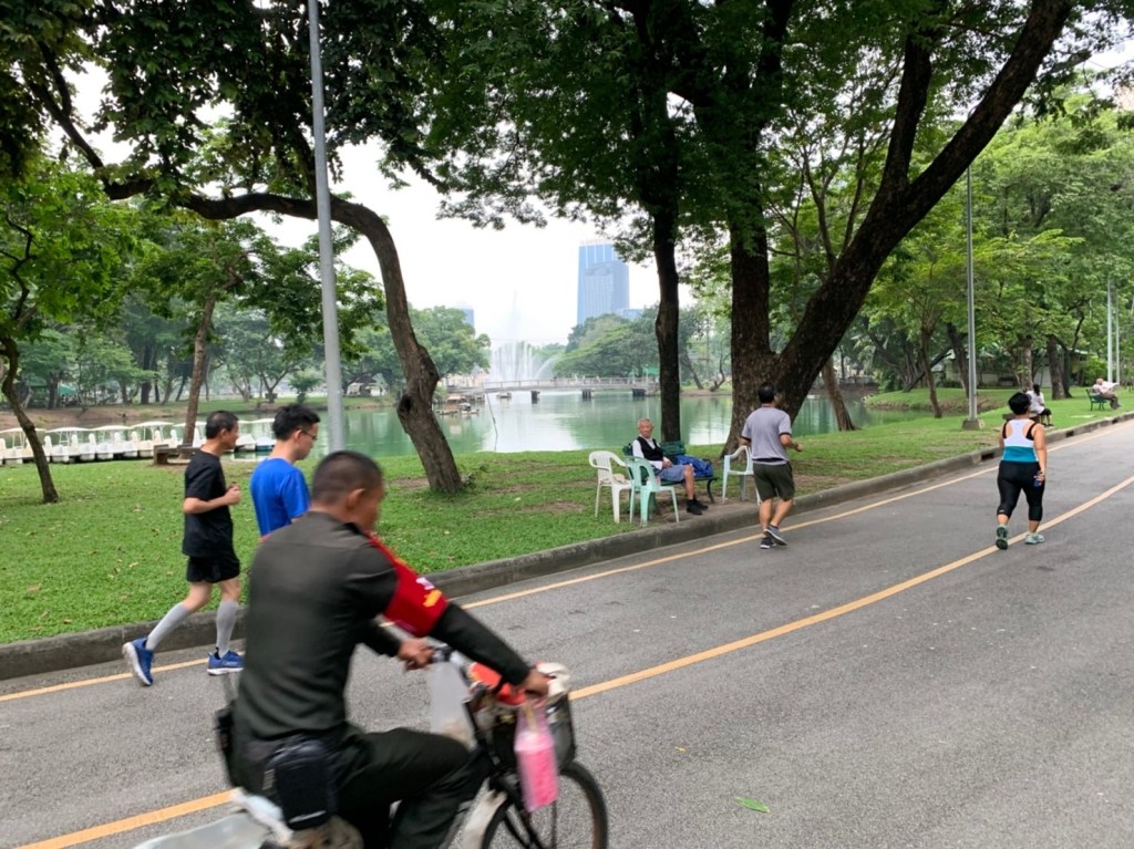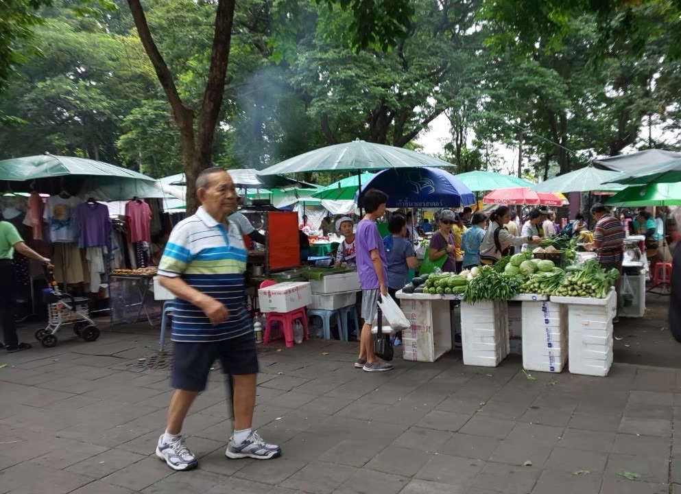 ドンムアン空港からタクシーに乗ること約30分。バンコクにあるルンピニ公園で一息つく。日本の緑地公園と同じく平和な朝の空気が流れていた。朝市も出ていたので立ち寄ってみる。